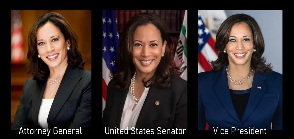 I remember searching her online and seeing her official portrait as California Attorney General. I’ve lined it up here - left to right - with the official portraits of her next two important jobs, US Senator, and Vice President of The United States.